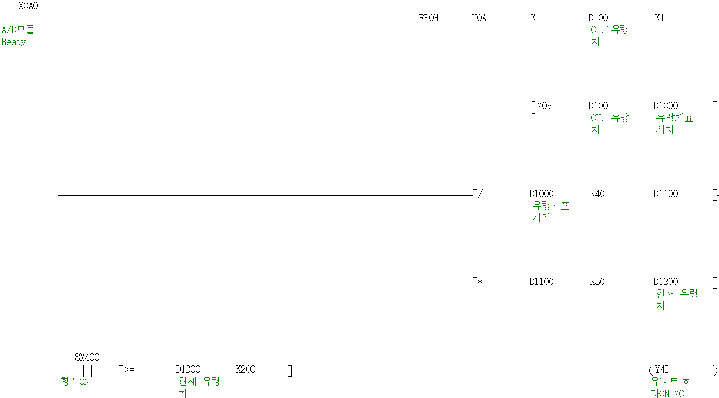항상 신호를 받고 있는 상태에서, K200 (숫자200)이 D1200(현재유량치) 보다 작거나 같으면 유니트 히타ON-MC를 작동시킨다.