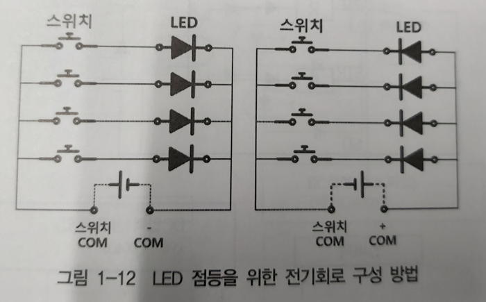 그림에서 알 수 있듯이 LED동작 전압은 DC24V, 포토트랜지스터의 동작전압은 DC5V이고 두개의 전원은 전기적으로 완전히 절연된 상태이다. 그림의 좌측에 있는 입력스위치가 눌러지면 LED램프는 점등된다. 즉, 전기스위치의 On/Off의 상태를 LED를 이용해 빛의 신호로 변환한다. 그림의 우측에 있는 포토트랜지스터는 LED의 빛을 검출해 포토트랜지스터를 On/OFF함으로써 DC5V의 전기신호를 만들어 낸다. 포토 커플러를 사용해 전기회로를 구성하면 DC24V의 입력측에서 전기적 문제가 발생하더라도 포토커플러의ㅣ LED만 손상이 되고, DC5V로 작동되는 포토트랜지스터에는 전기적 충격이 전달되지 않기 때문에, 인버터의 내부회로는 외부의 전기충격에 영향을 받지 않고 안전하게 동작할 수 있는 것이다. 아래 그림은 여러 개의 스위치를 사용해 각각의 램프를 ON/OFF하기 위한 전기회로를 나타낸 것이다. 그림에서 알 수 있듯이 스위치COM과 램프COM이 있음을 알 수 있다. 전기회로에서 COM(Common)은 여러 개의 전선을 하나로 로 묶어서 동일한 극성의 전원을 공급하기 위한 전선을 의미한다.