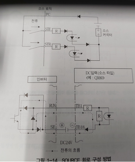 [그림 1-13]의 위쪽의 전기회로는 인버터의 동작 상태를 나타내는 출력을 이용해 PLC입력을 On/Off 시키는 전기회로를 나타낸 것으로 싱크 로직으로 연결하는 방법을 나타낸 것이다. 인버터의 출력에 사용된 트랜지스터가 NPN타입이고, NPN타입은 전류를 트랜지스터의 콜렉터(Collector)단자를 거쳐 에미터(Emitter)에 연결된 SE로 흐르게 하기 때문에 싱크 로직의 전기회로가 구성된다 [그림 1-14]는 소스로직의 전기회로 구성을 나타낸 것이다. 쇼트 핀을 소스로 선택하면 인버터의 PC단자로, 인버터에 내장된 DC24V의 +극이 연결되고 포토커플러의 COM단자에 0V극이 연결된다. 인버터의 입력단자 STF, STR에 연결된 스위치에 의해 전류가 인버터 내부로 포토커플러의 LED로 흘러들어가게 되는 전기회로가 구성된다. 즉 인버터의 외부에서 인버터 내부로 전류를 공급하기 때문에 소스라 한다.