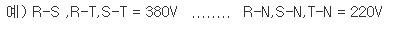 #RST - 3상 3선식 R - 흑색, S - 적색, T - 청색 N - 백색 또는 회색 N상은 3상 4선식으로 200V를 사용하기 위함입니다. RST상 중 한상 과 다른 한상의 전압은 380V 가 되며, RST상의 어느 한 상과 N상은 220V가 됩니다.
