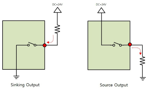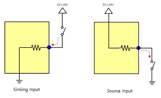 PLC 등의 장비에서 입출력 접점 (Digital Input / Output) 은 크게 싱크(Sink) 타입과 소스(Source)타입이 있다. 싱크는 입출력 접점으로 전류가 들어가는 것을 의미하고, 소스는 입출력 접점으로 전류가 나오는 것을 의미한다
