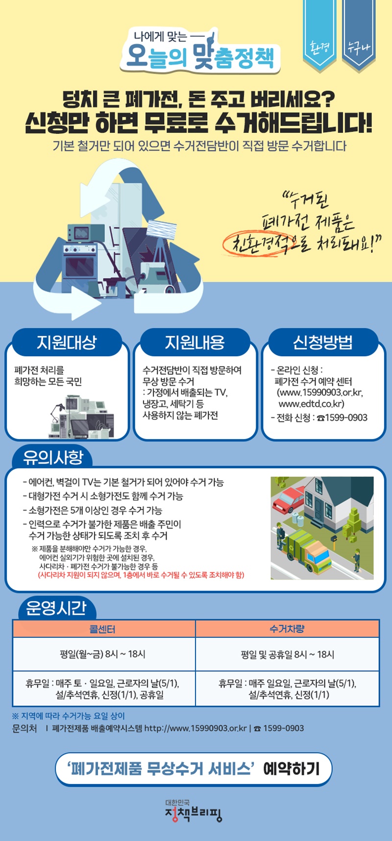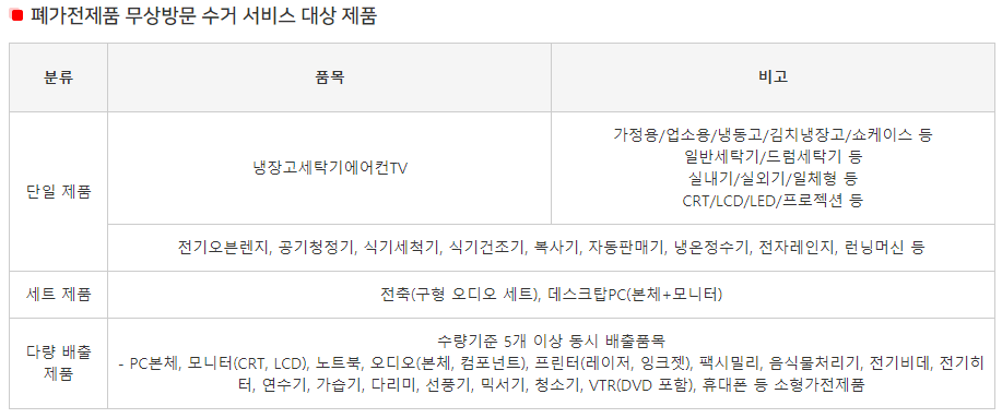 내용: 수거전담반이 직접방문하여 무상수거 , TV, 냉장고, 세탁기 , 사용하지 않는 폐가전 등
