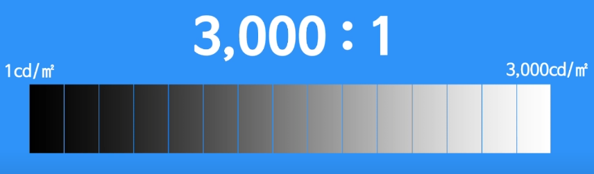 : 디스플레이가 가장 밝은 색과 가장 어두운 색을 얼마나 잘 표현하는지를 나타내는 수치입니다.